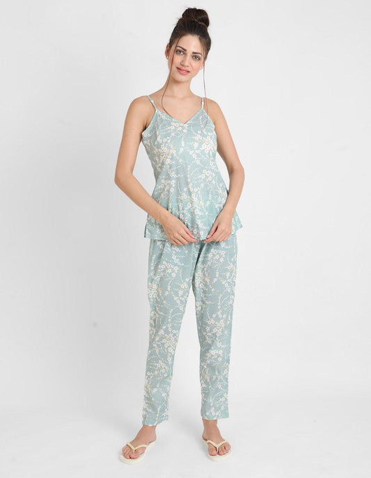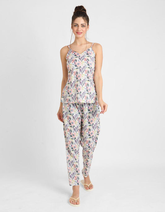 Rosy Pink Flower Printed Singlet Pyjama Set For Women