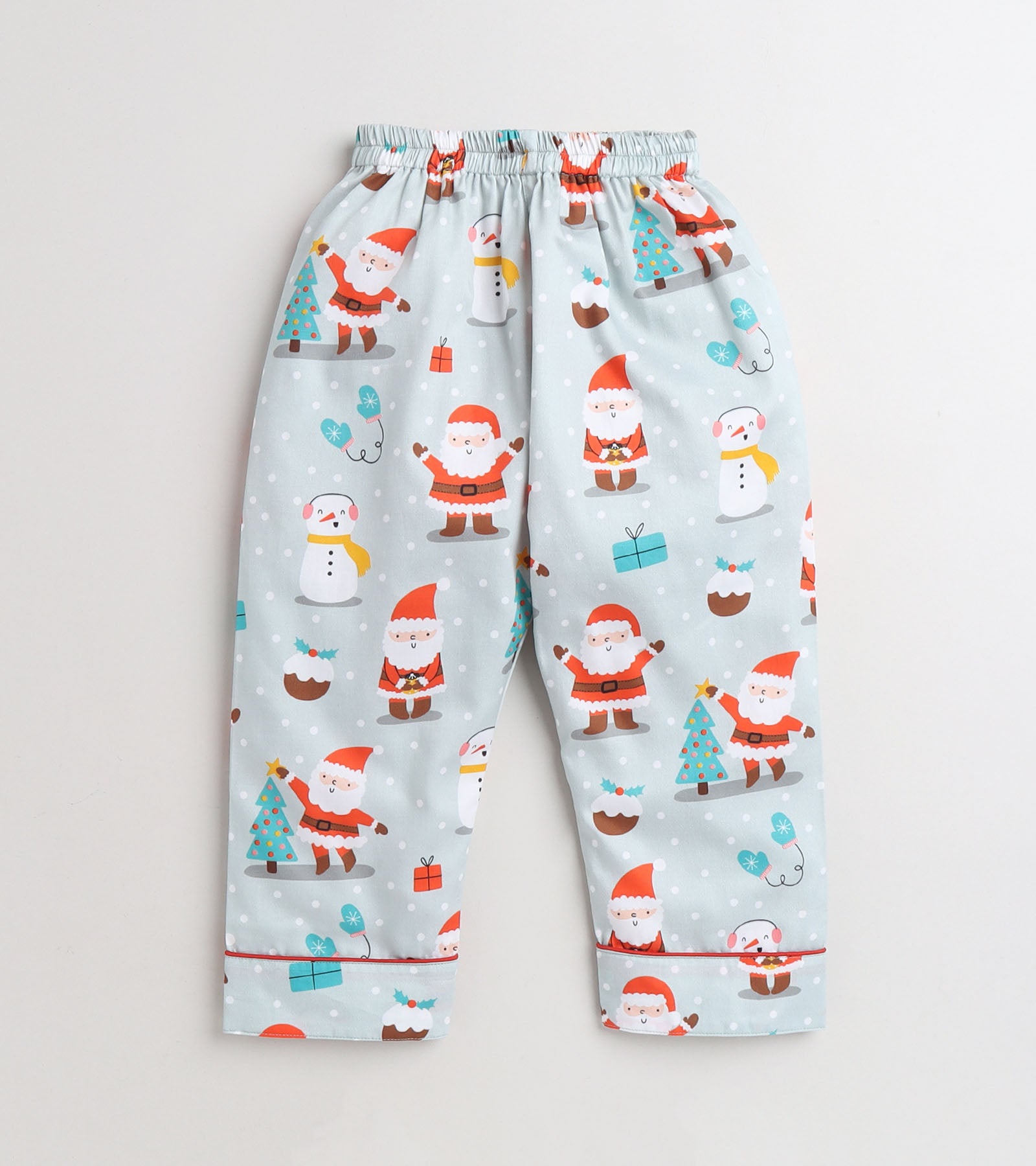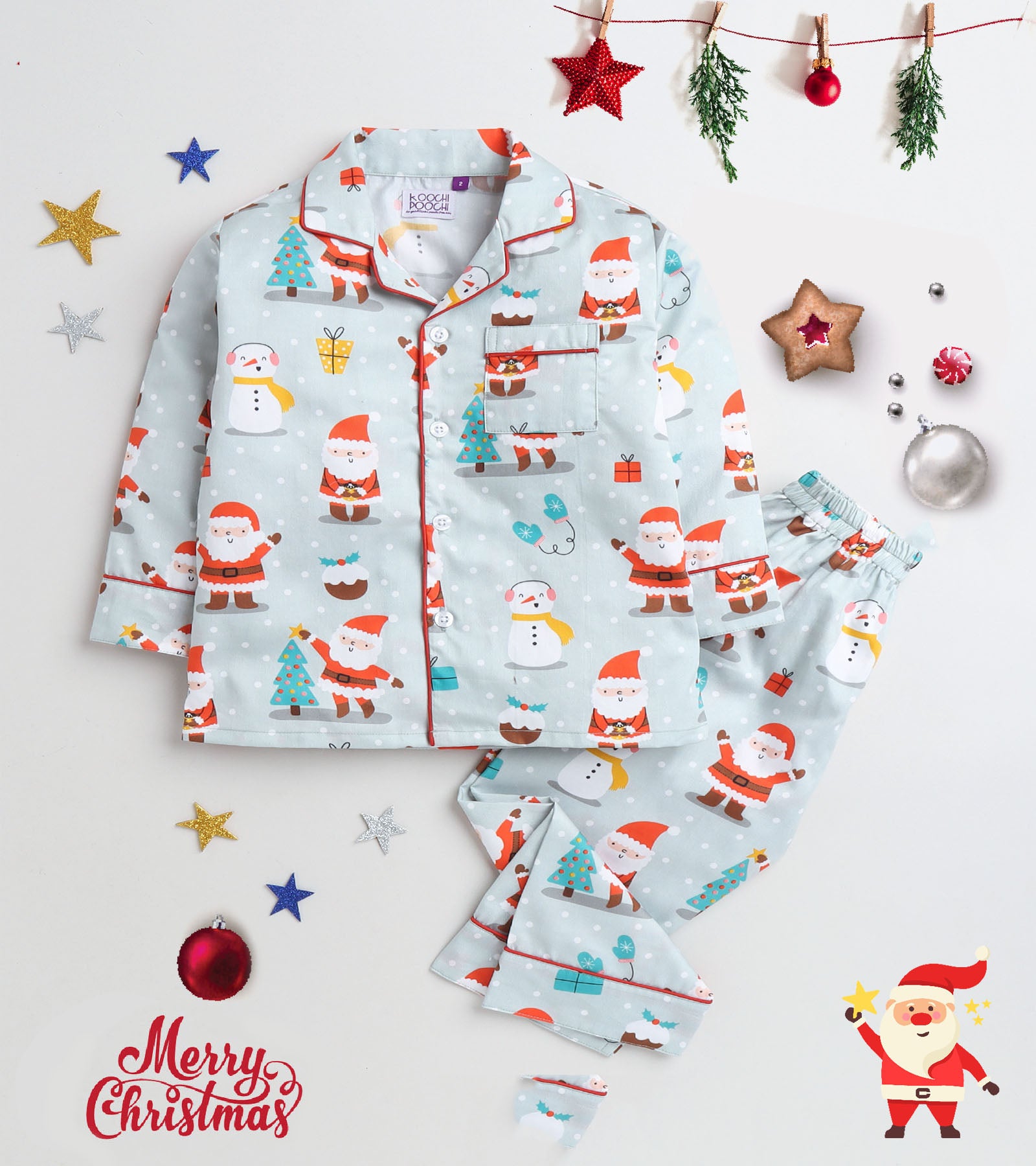 PRINT & DESIGN: This classic Grey base notched collar pyjama set features a full-sleeve shirt and full-length festive christmas printed cute santa look pyjama. The soft elastic bottom with contrast cording adds a touch of style to this adventurous ensemble. The vibrant prints resist fading, ensuring the ensemble retains its charm wash after wash.
