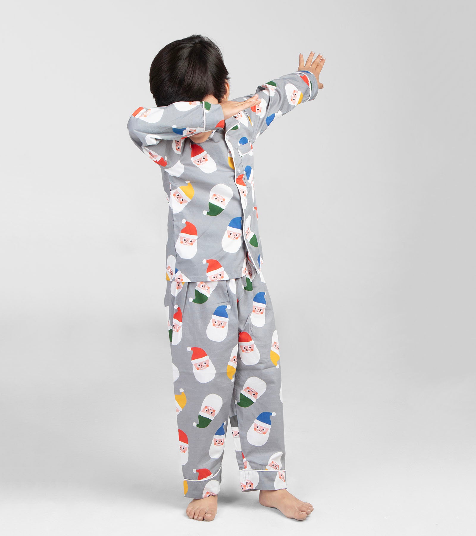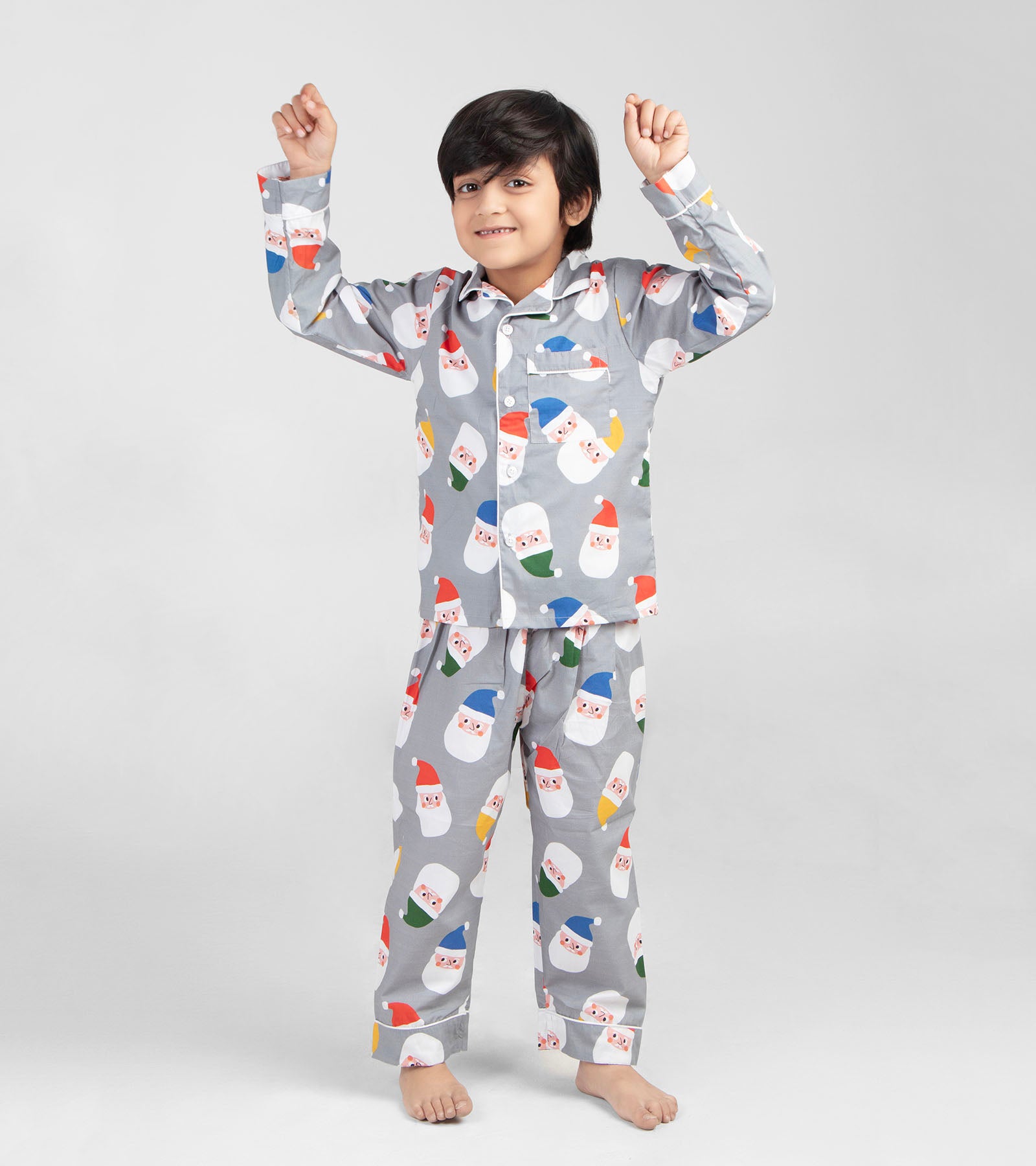 Grey Base with multi colour santa cap in festive print in the classic notched collar pyjama set in full sleeve shirt and full length stripped pyjama featuring button up front and soft elastic bottom with contrast cording.