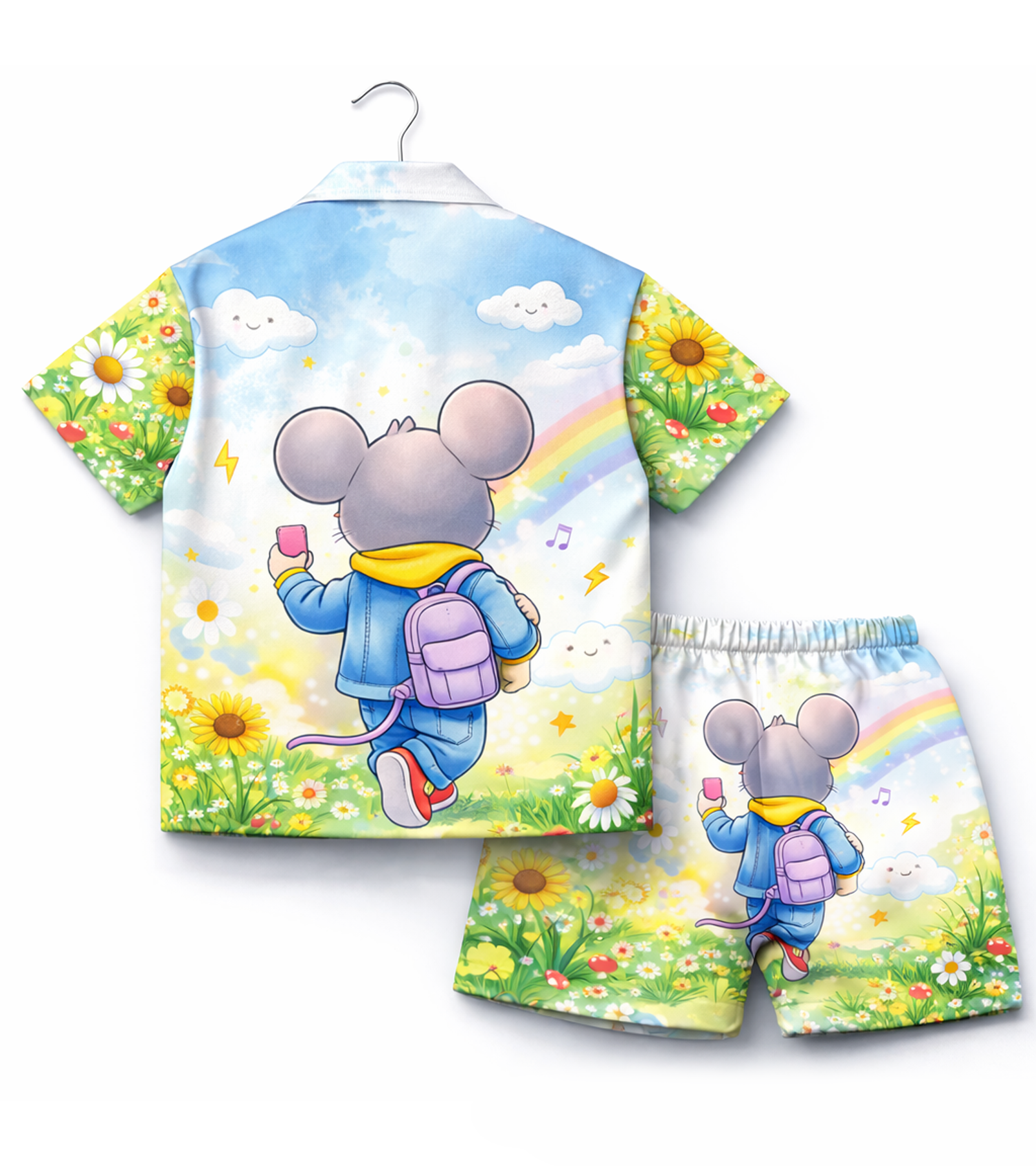 Bright, cheerful and full of personality, this Rainbow Mouse Co-Ord Set is perfect for playful summer days. Featuring a cute cartoon mouse with rainbow and sunshine elements, this outfit brings fun and comfort together. Made from soft, breathable cotton fabric, it keeps your little ones cool and happy all day long. Ideal for casual outings, vacations, and everyday wear.