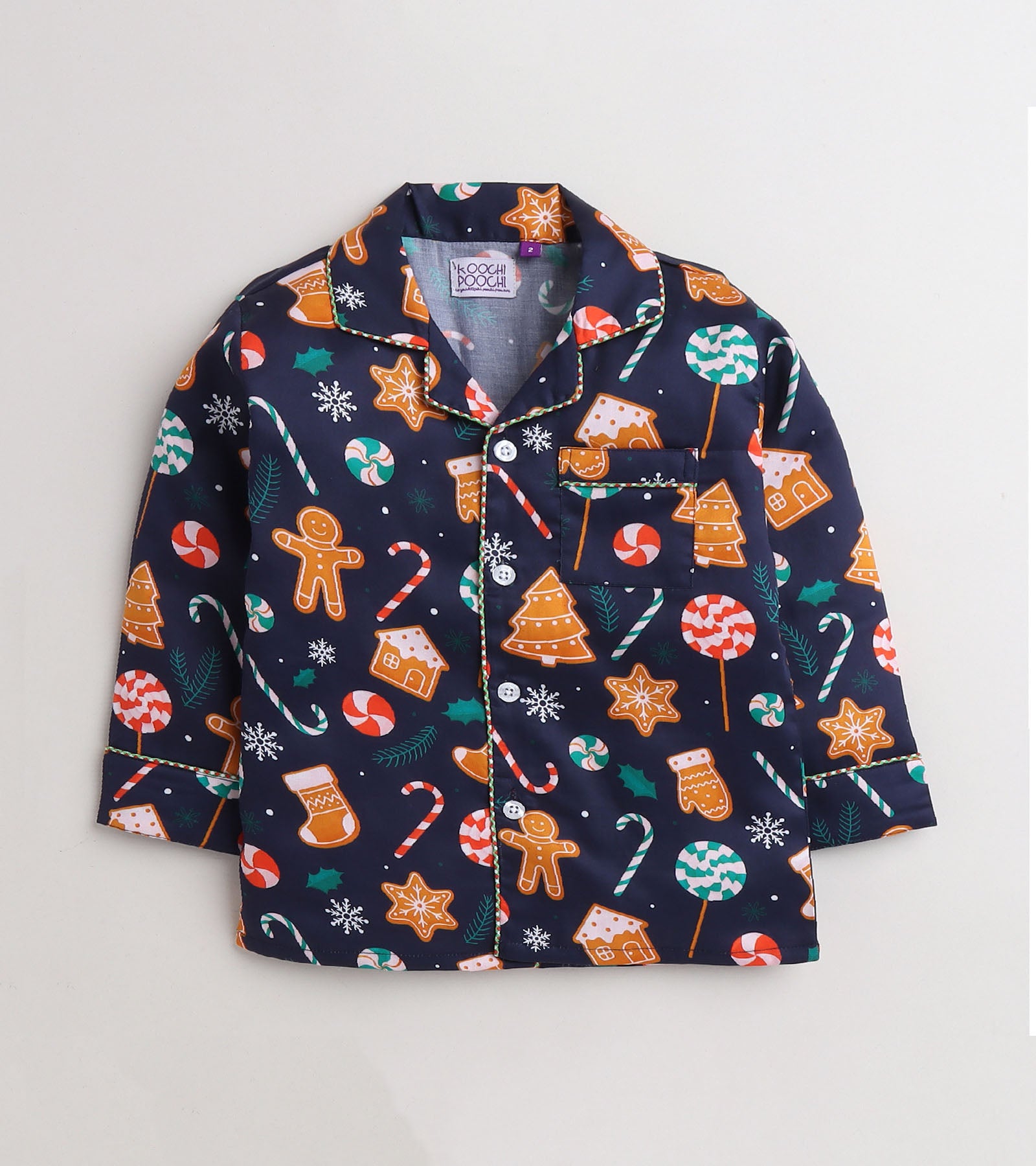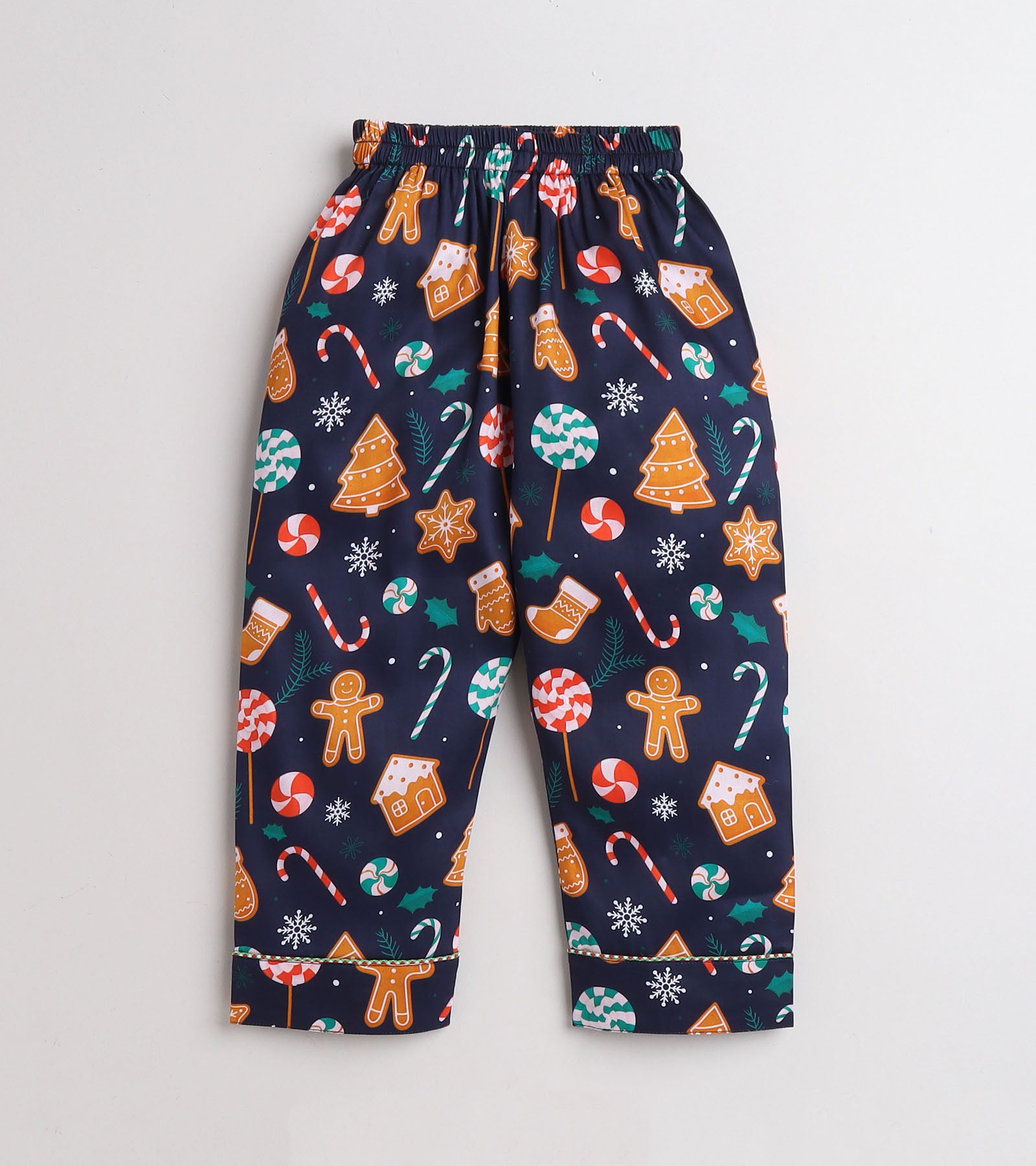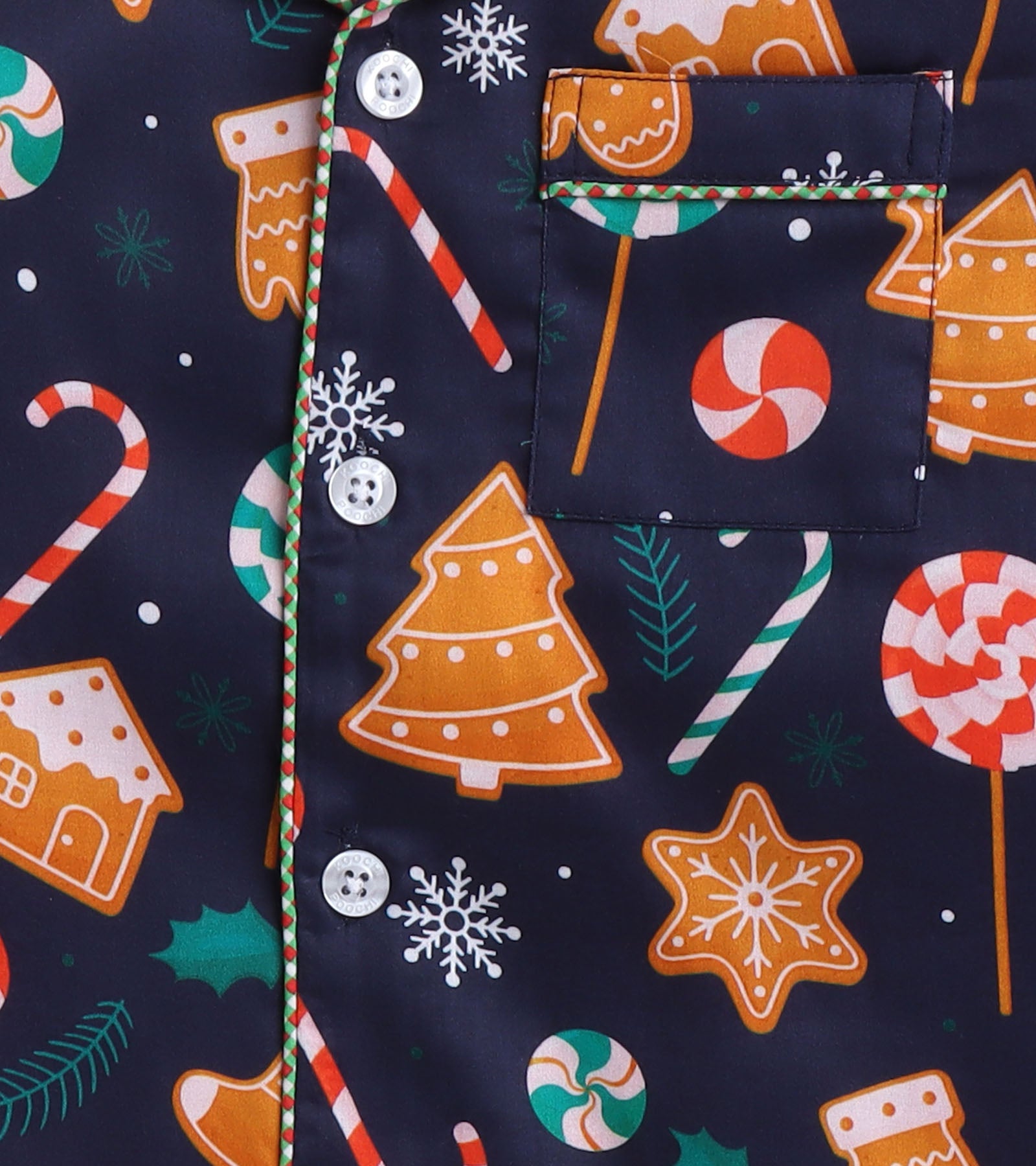 PRINT & DESIGN: Featuring a classic Navy Blue base adorned with cheerful colourful festive Christmas prints, this design exudes playful charm. The full sleeve shirt and full-length printed pyjama ensure ultimate comfort, while the button-up front and soft elastic bottom with contrast cording add a touch of elegance. Perfect for cozy nights and sweet dreams!
