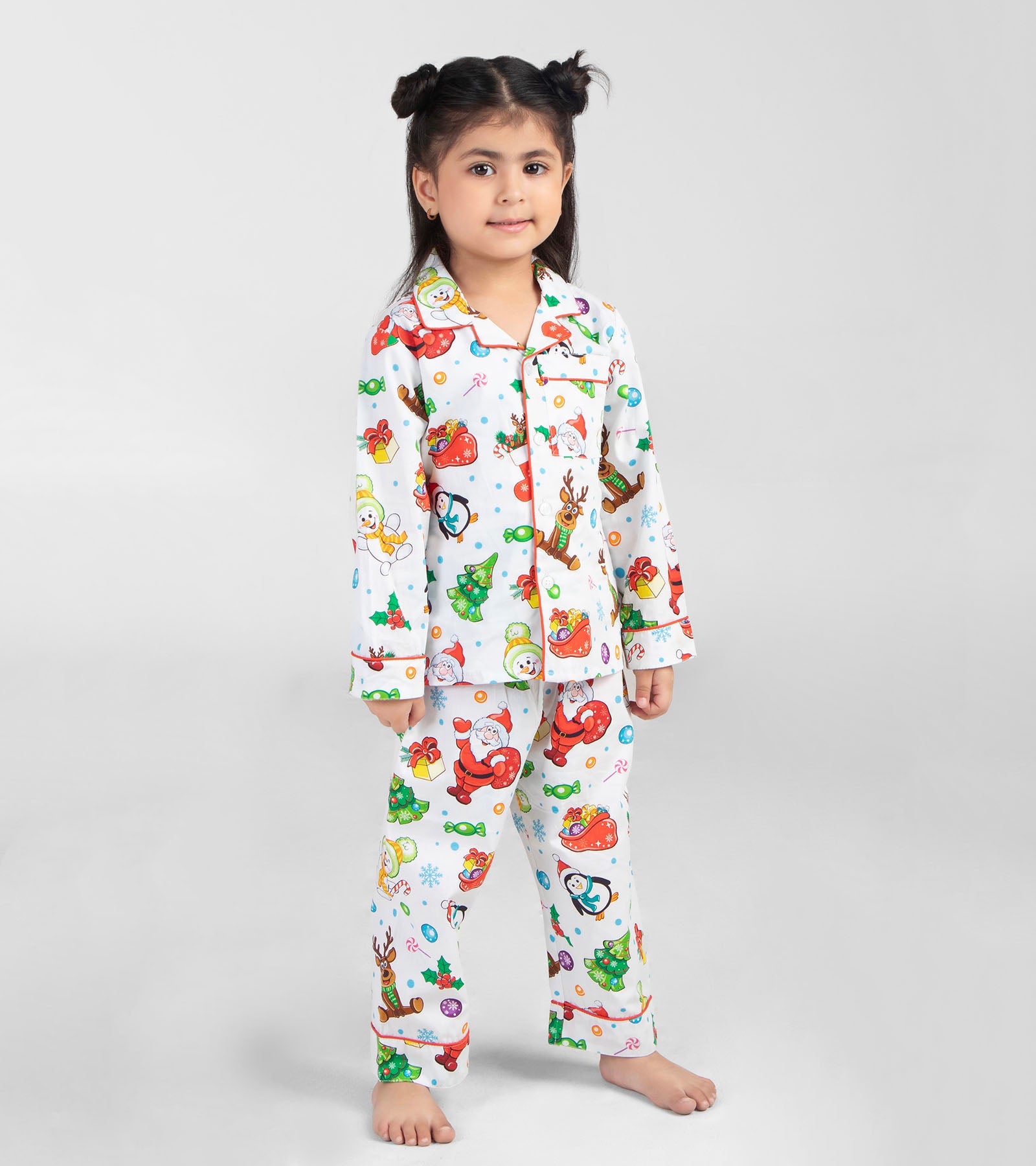 White Base with everything festive inspired print in the classic notched collar pyjama set in full sleeve shirt and full length stripped pyjama featuring button up front and soft elastic bottom with contrast cording.