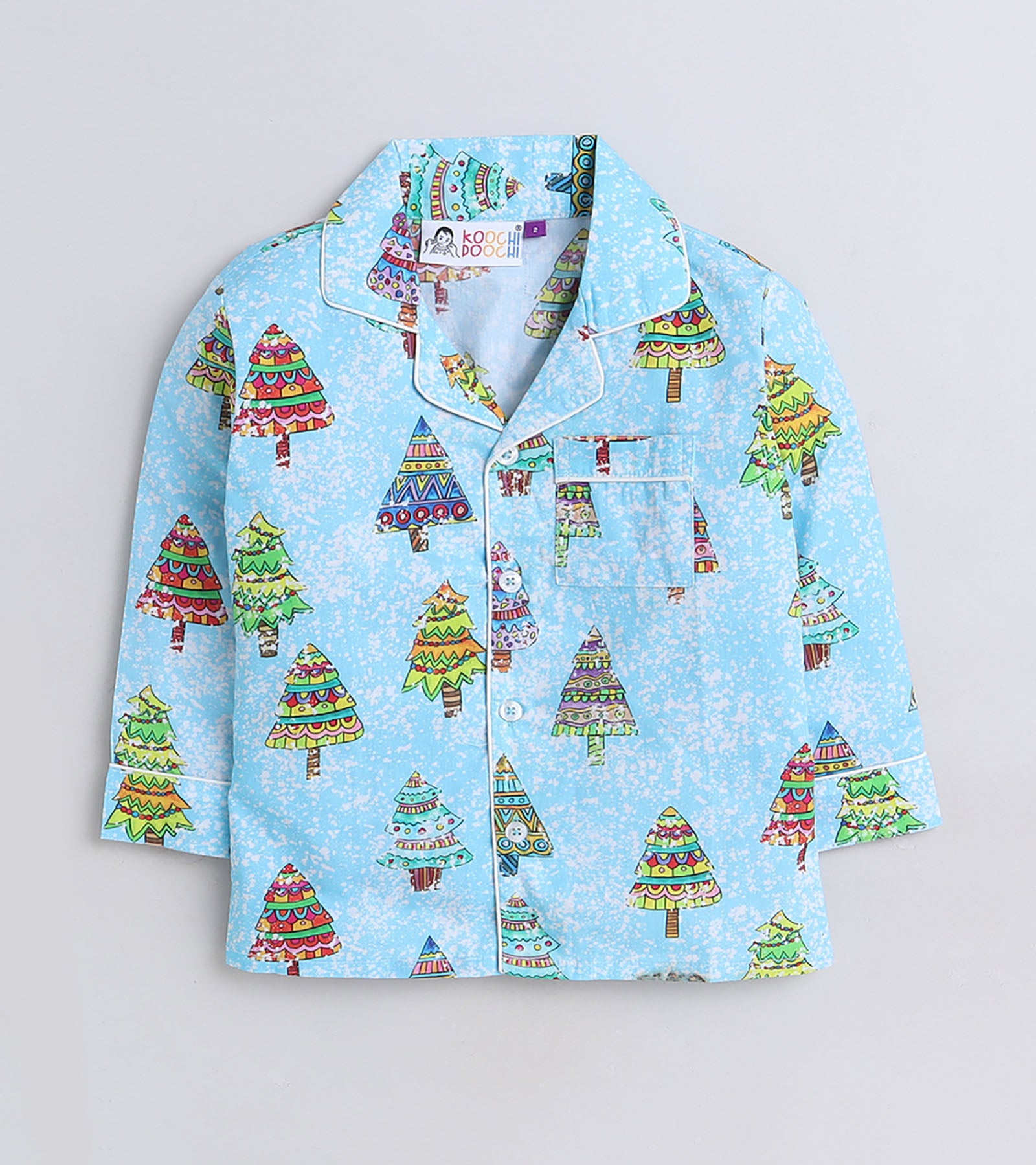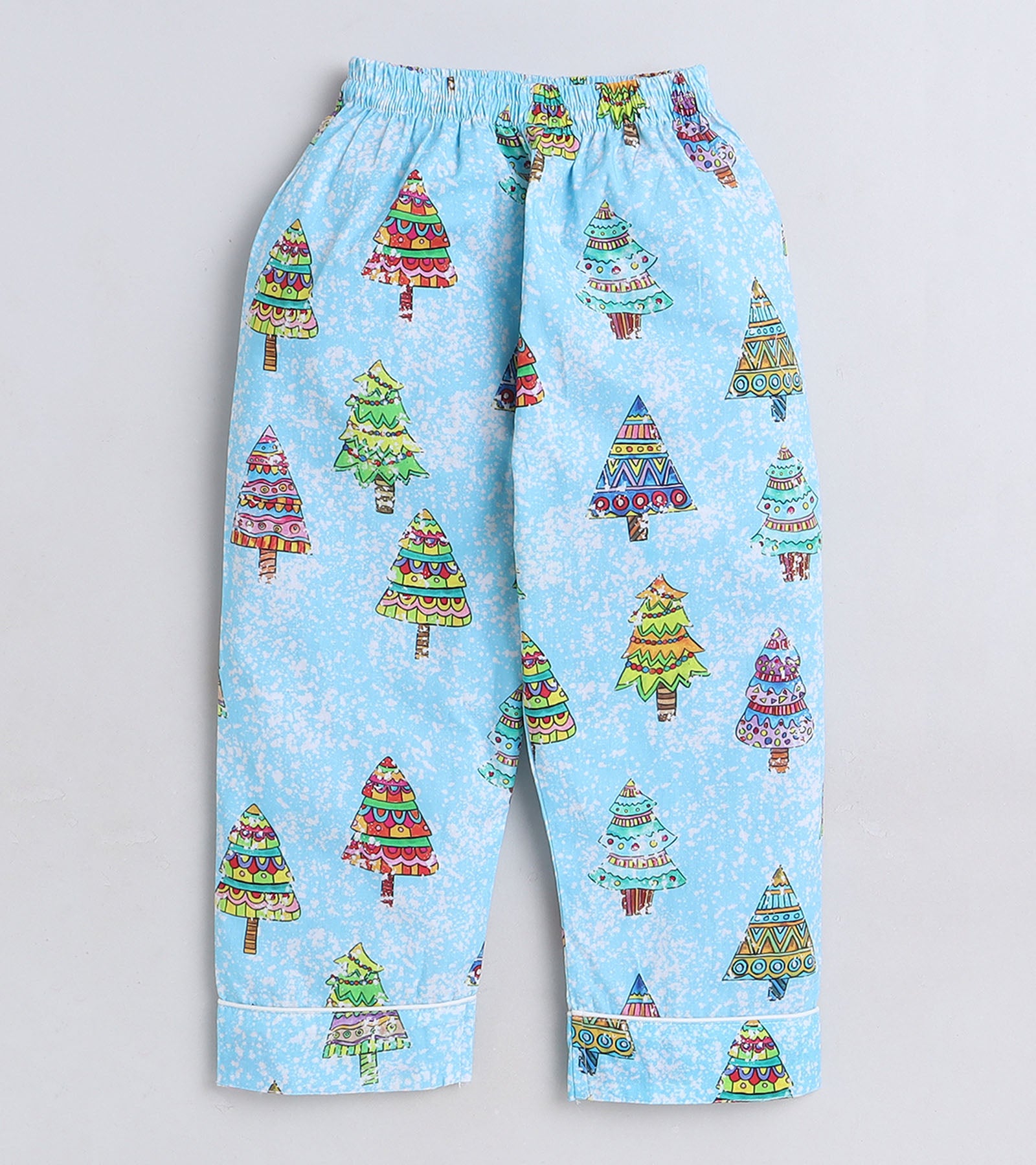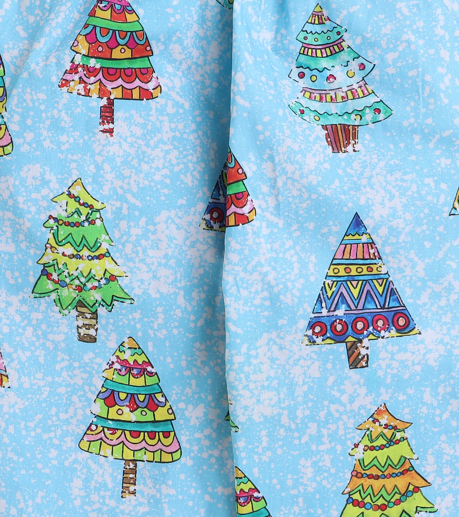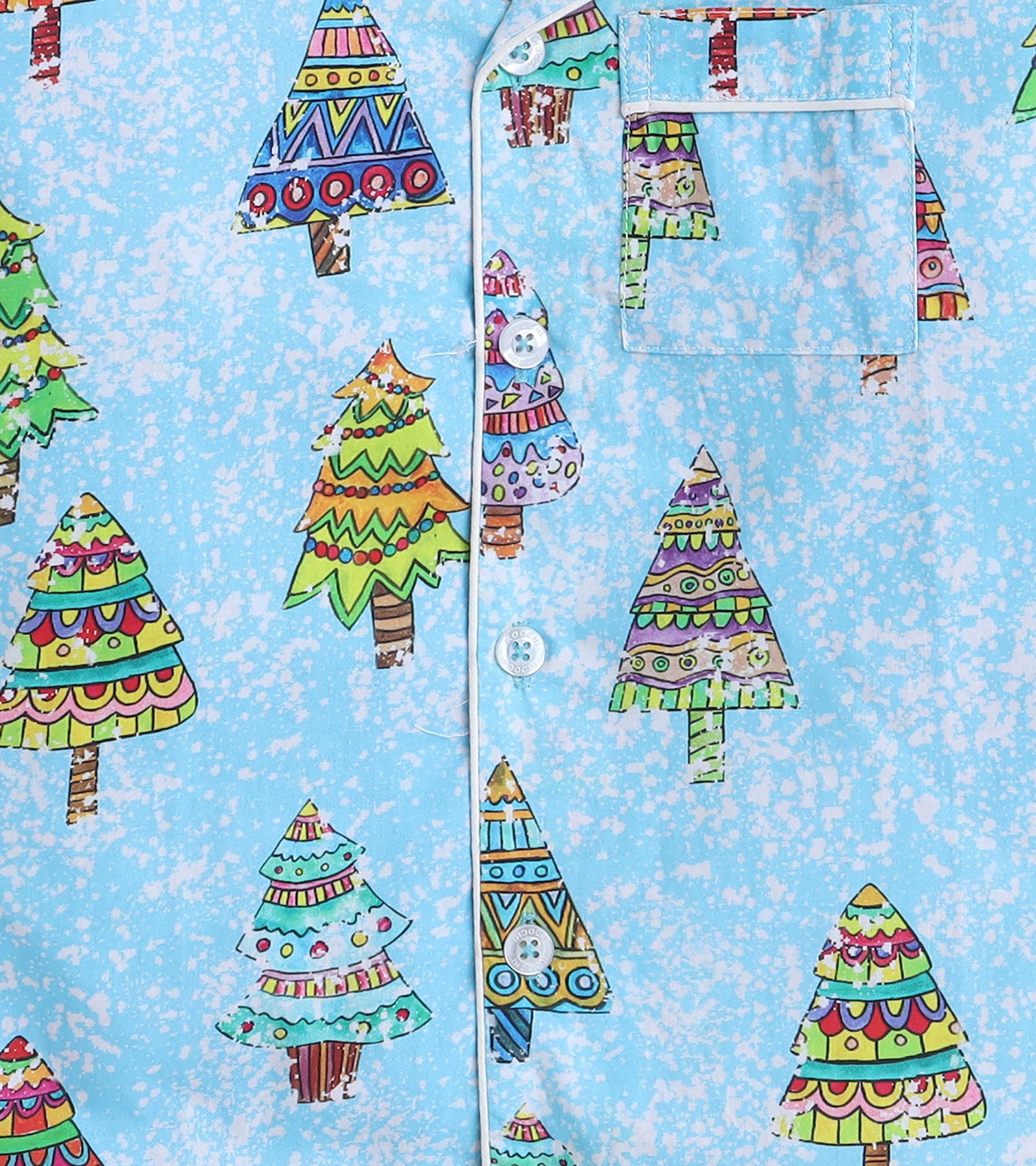 PRINT & DESIGN: Featuring a classic sky Blue base adorned with cheerful colourful Snow christmas tree prints, this design exudes playful charm. The full sleeve shirt and full-length printed pyjama ensure ultimate comfort, while the button-up front and soft elastic bottom with contrast cording add a touch of elegance. Perfect for cozy nights and sweet dreams!